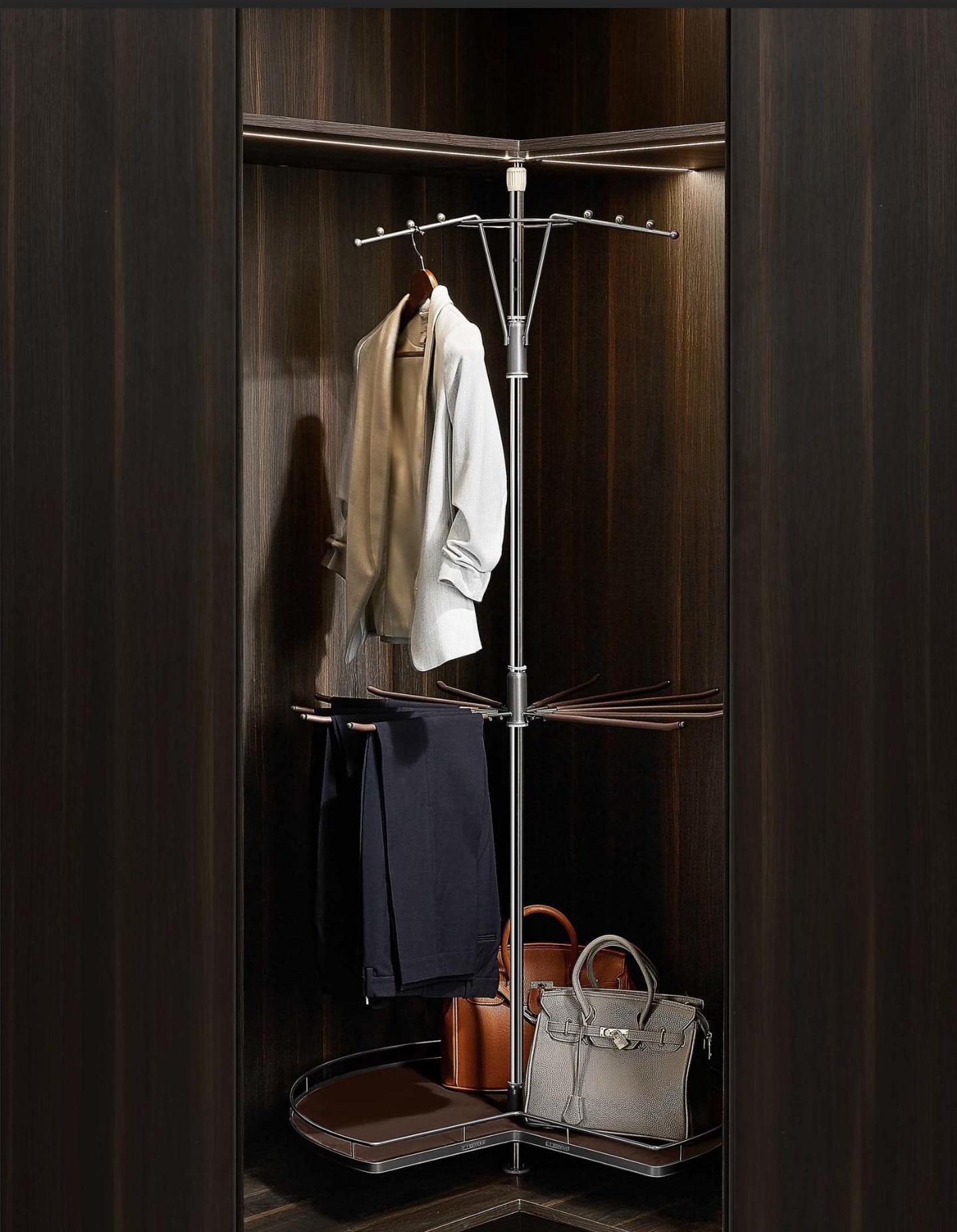 Разделите труднодоступное высокое и глубокое пространство в углу на три удобных положения, превратив его в вместительное пространство для хранения сумок, одежды и чемоданов.