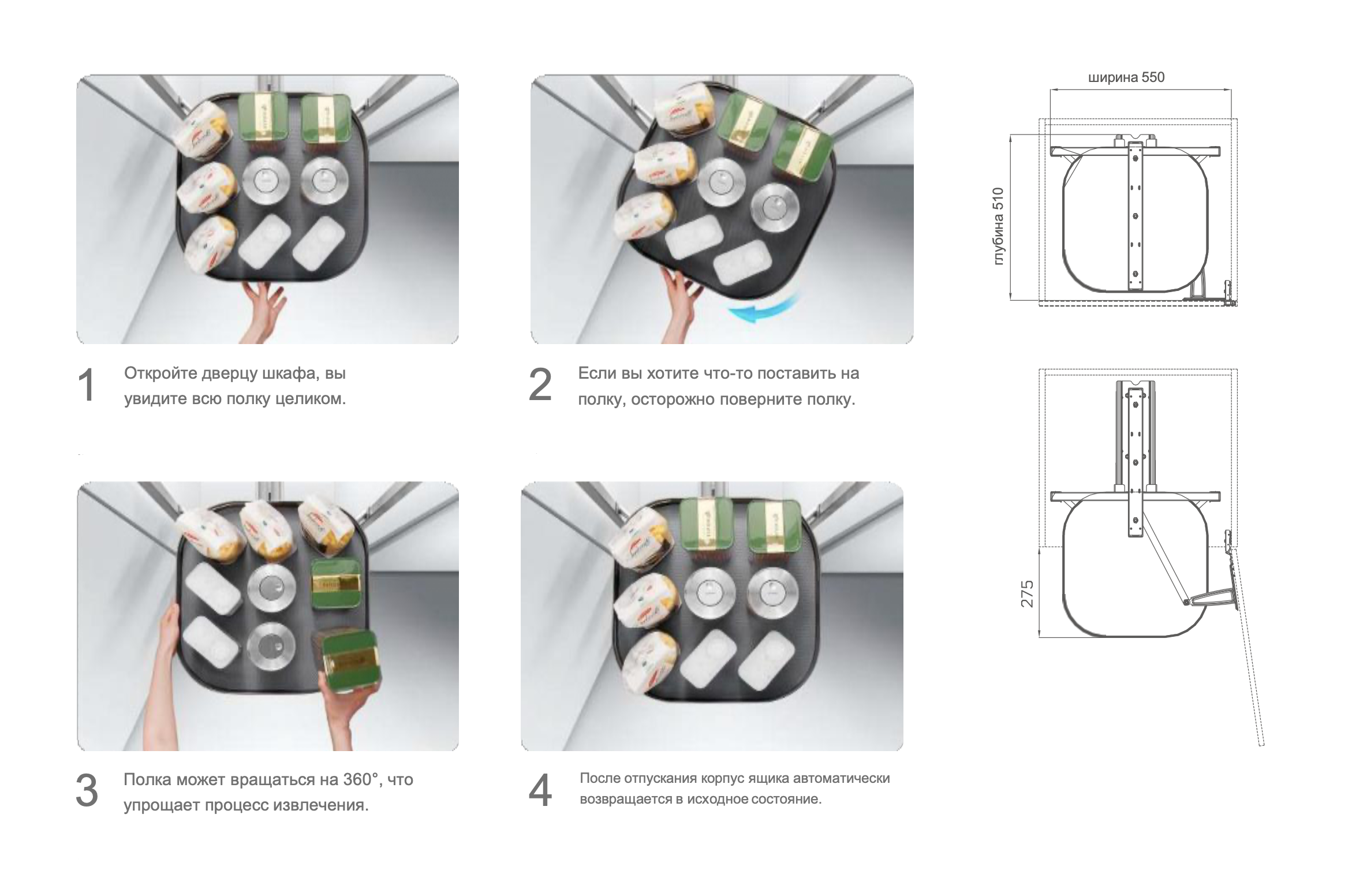 Кладовая Tourbillon представляет собой революционный способ использования вращающейся кладовой, предоставляя пользователям более удобные решения для хранения в шкафу.